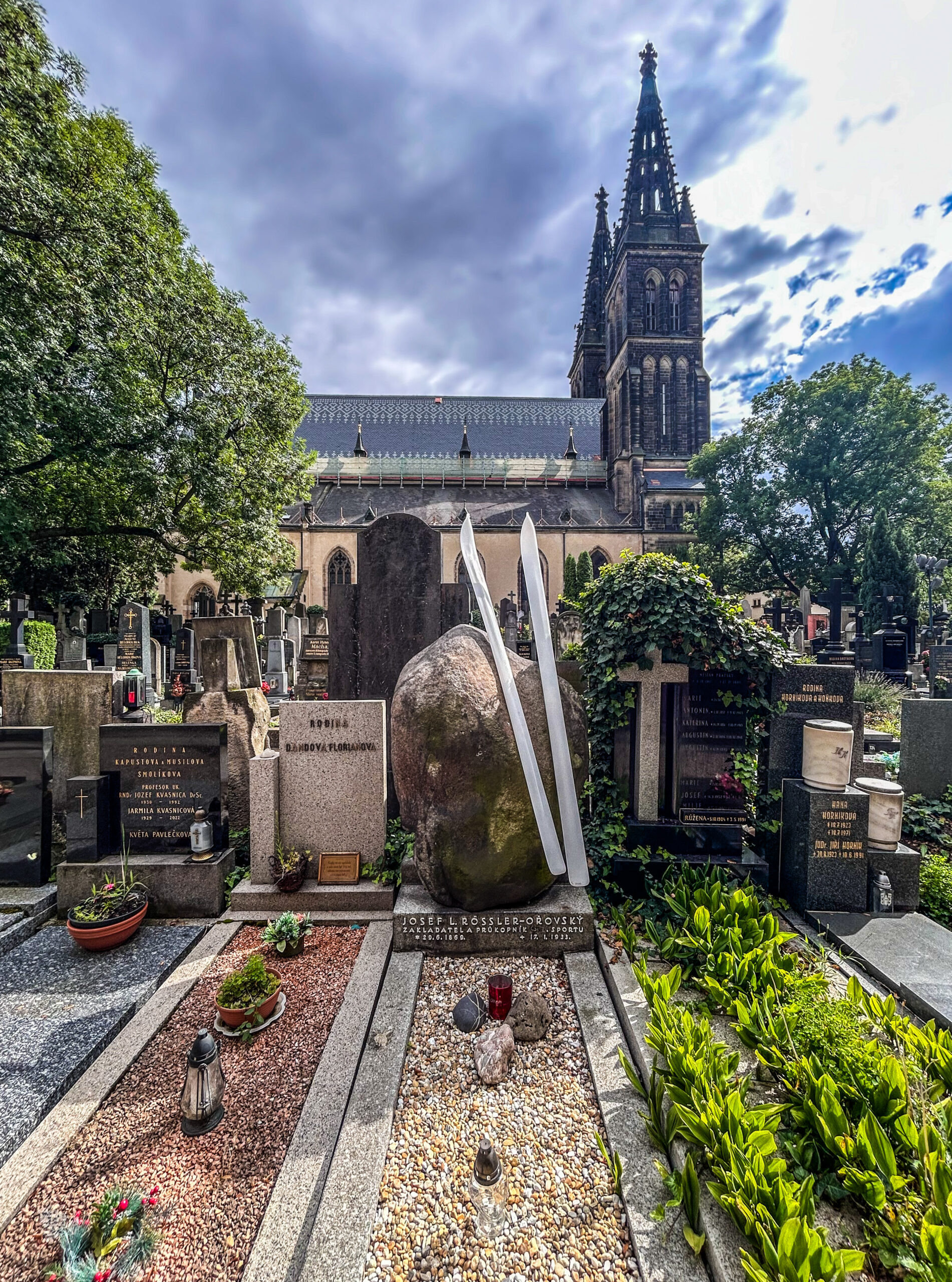 Nie zabrakło akcentów narciarskich! Na cmentarzu na Wyszehradzie, na którym spoczywa wielu zasłużonych Czechów, znalazłem jeszcze jedną, narciarską mogiłę. Spoczywa w niej Josef Rössler-Ořovský – nazywany “ojcem czeskiego sportu” działacz i promotor z przełomu XIX – XX wieku. Był współtwórcą Czeskiego Komitetu Olimpijskiego i dyplomatą, sędziował pierwsze derby Sparta Praga – Slavia Praga w marcu 1896r. i uprawiał szereg dyscyplin, przy czym – co mnie nie dziwi – w szczególności miłował narciarstwo. Dzisiaj przypomina o tym ten wyjątkowy pomnik.